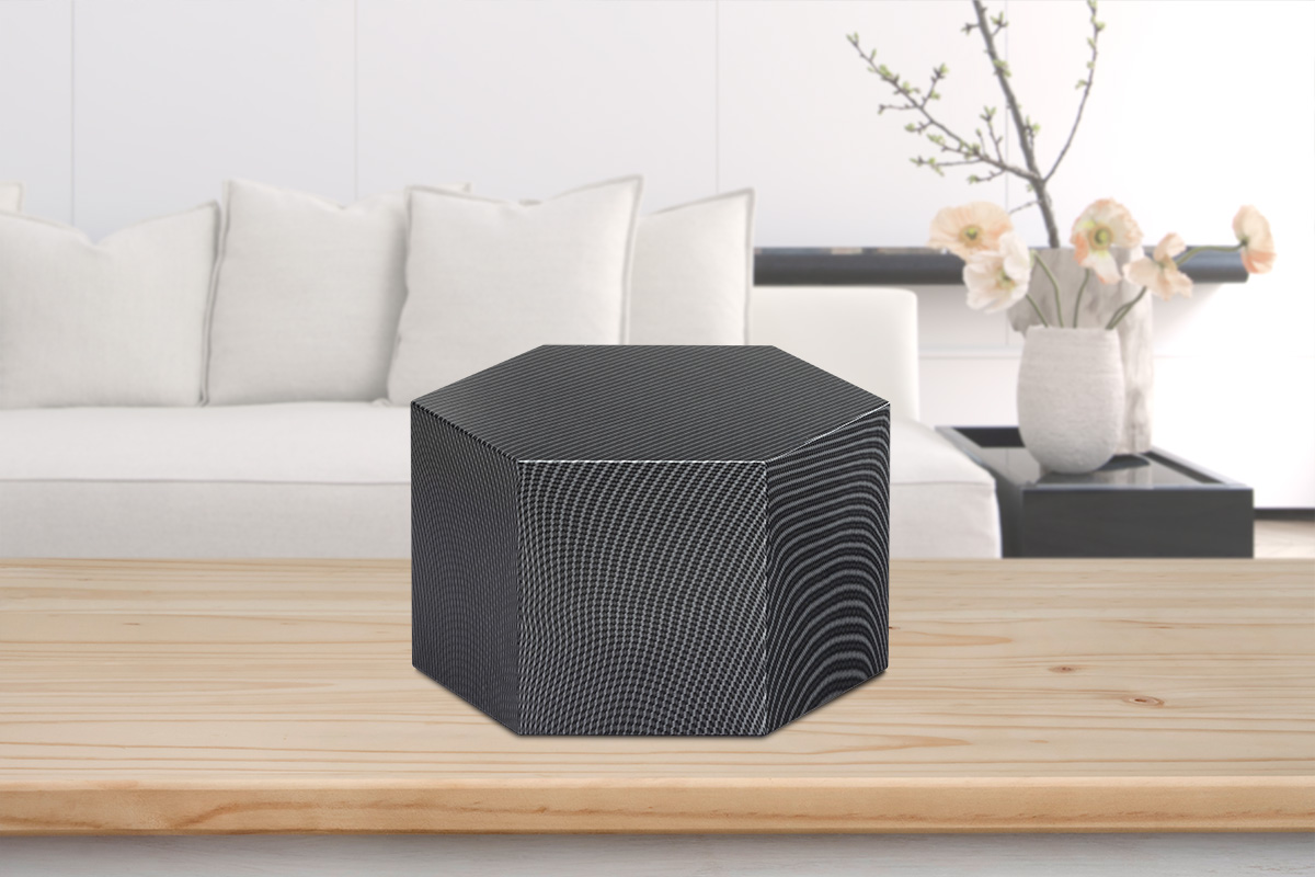 La forma classica del poliedro a sei facce rivestita da superfici dal gusto contemporaneo.