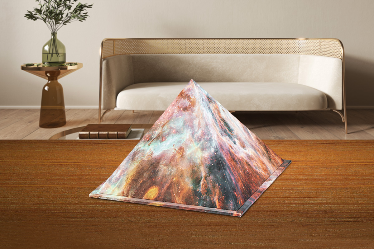 Urna in legno di forma piramidale con effetto fantasia.